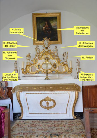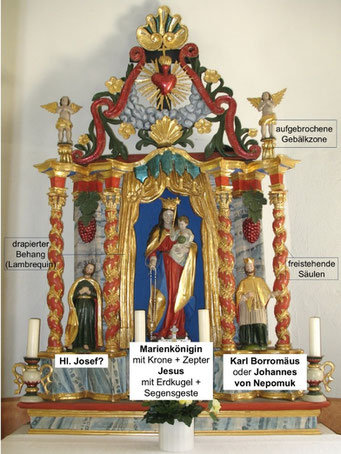 - Barock: freistehende spiralförmige Säulen – aufgebrochenes Gebälk - Rokoko: geschweifte Sockel- und Gebälkzone - Unter der blau-weissen Zierblende und dem drapierten Tuch steht die hl. Mutter Gottes im Altarzentrum. - Links der Mutter Gottes steht wahrscheinlich der hl. Josef. - Rechts der Mutter Gottes steht Karl Borromäus oder Johannes von Nepomuk. - Die Proportionen der zwei Assistenzfiguren stimmen nicht mit der Marienstatue überein. - Gemäss mündlichen Überlieferungen wurde die Mutter-Gottes-Statue ersetzt.